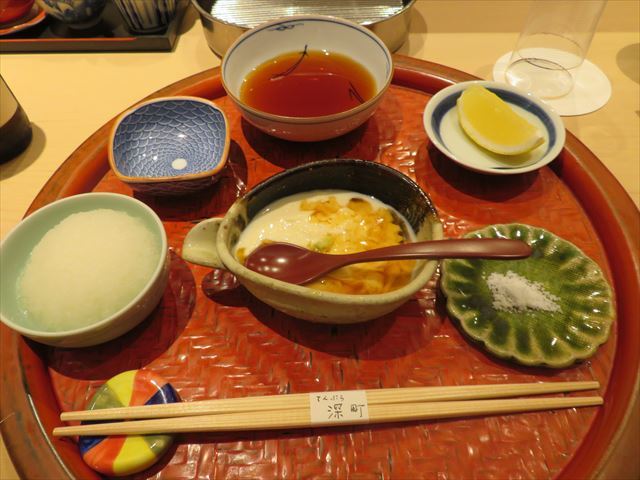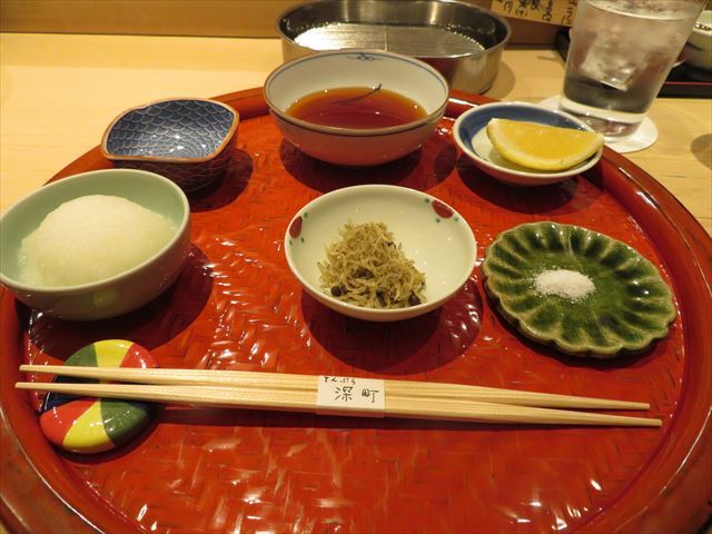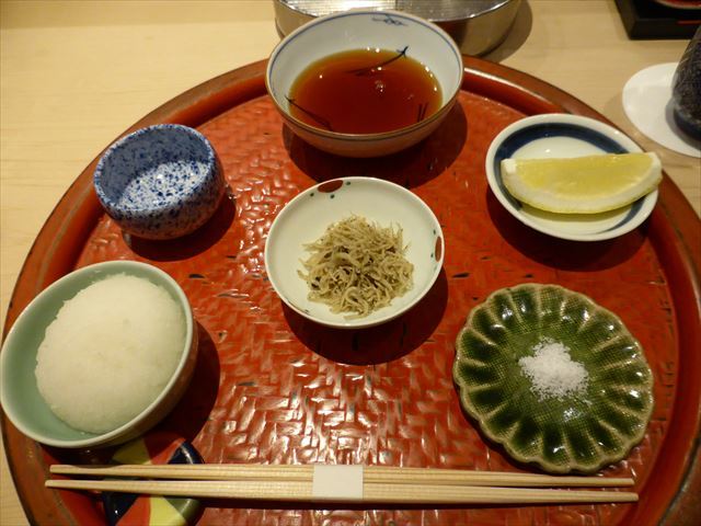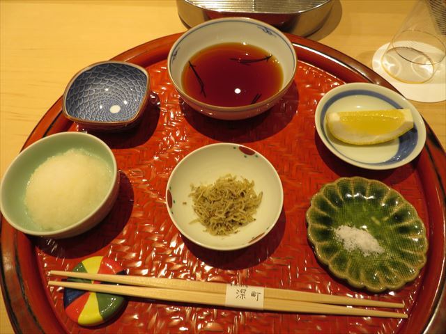 天汁・塩・レモンなどが準備されている御膳に縮緬山椒。