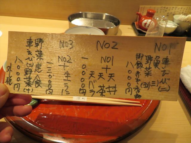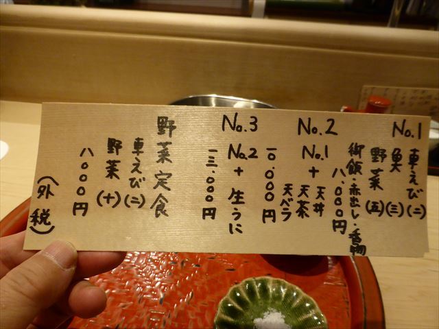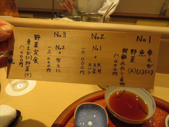No.2 1万円(税別) ;No.1(海老2、魚3、野菜5)+天丼(天茶、天バラ)