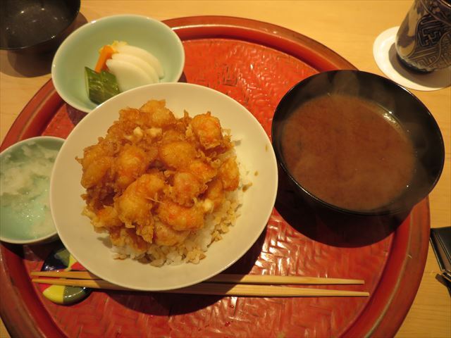 天丼を一口食べた後、赤出汁が来るまで食べるのを中断して待った。