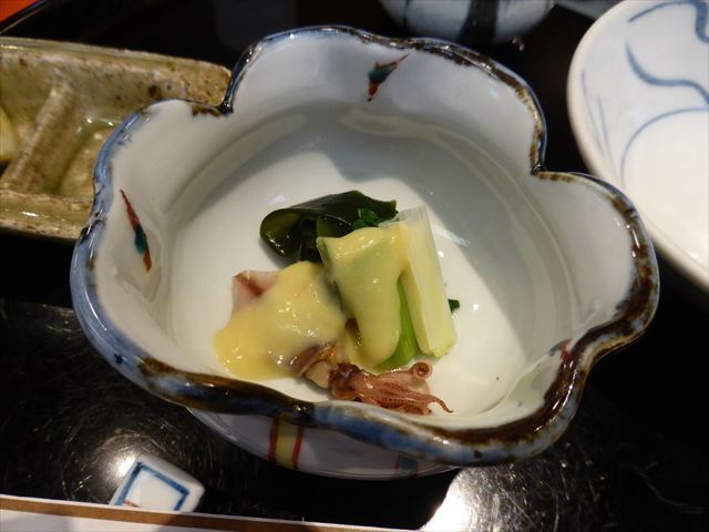 △□ 先付;蛍烏賊・分葱・若布の酢味噌和え
