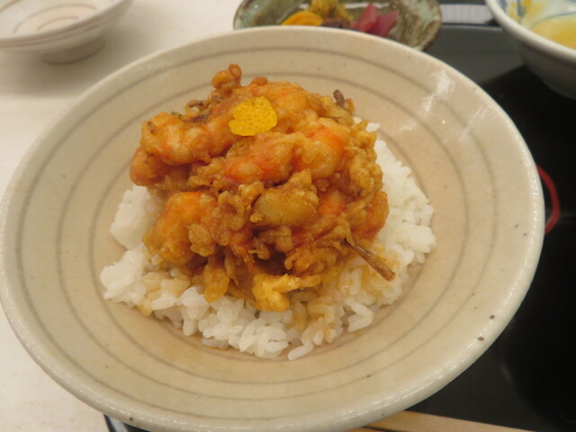 □ 海老かき揚げ天丼:芝海老と三つ葉(貝柱は良いのが未だは要らないので入れてないとの事)。