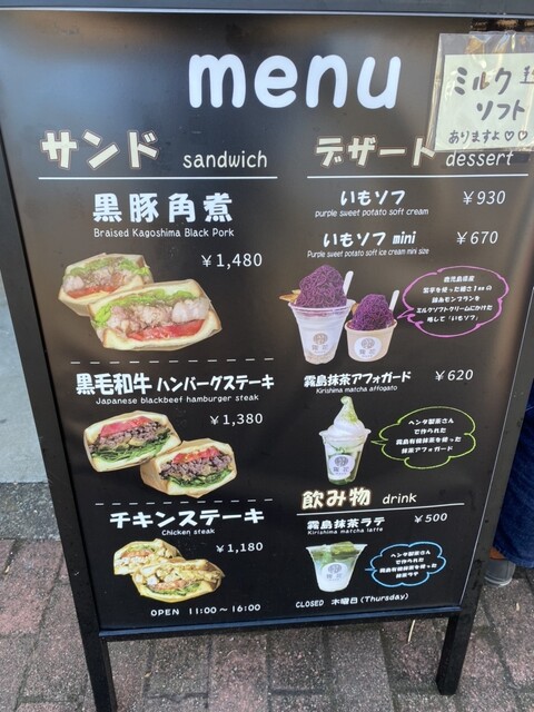 すぐ食べるおやつで「いもソフmini」を、夜ごはん用の持ち帰りで「黒豚角煮サンド」「黒毛和牛ハンバーグステーキサンド」をテイクアウトしました。