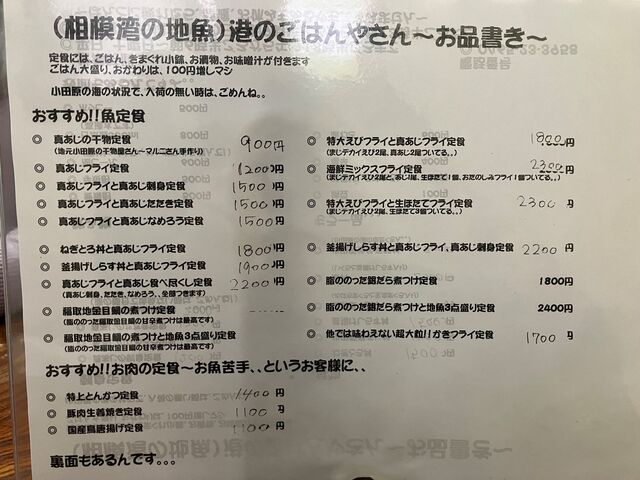 メニューを再確認。で、アジフライ中心に、