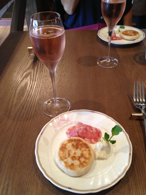 さて、テーブルにつき夏らしくロゼのスプマンテをいただきながら、川崎シェフにお料理はお任せします。