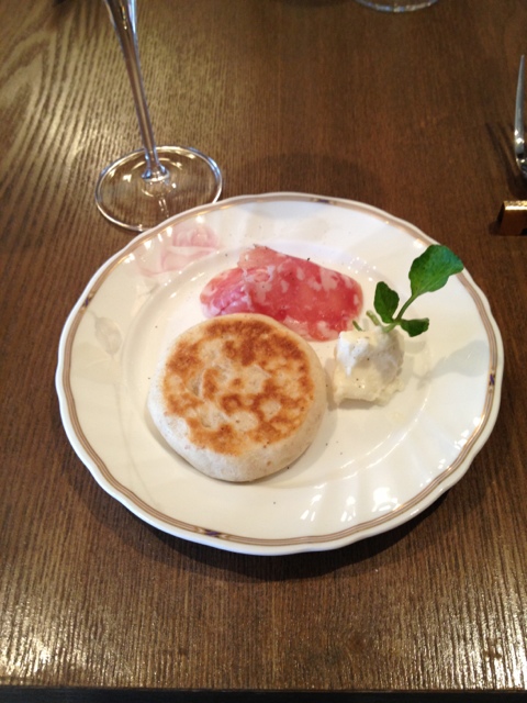 まずアミューズは、ボローニャのアメリゴ近辺のパンケーキであるティジェッラとサラミですが、