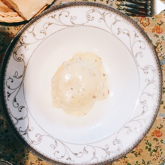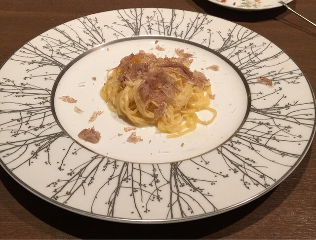 細見のタヤリンを白トリュフがふわりと包んでいる。