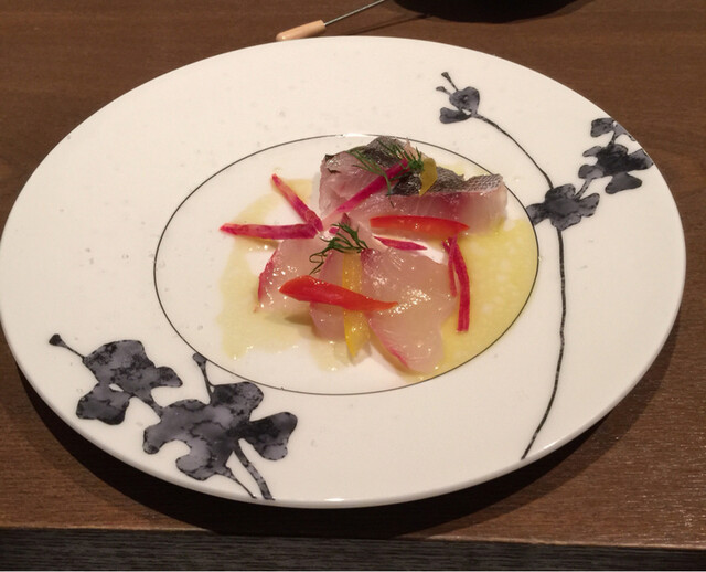 前菜の一皿目はイサキ、水蛸、真鯛のカルパッチョ。