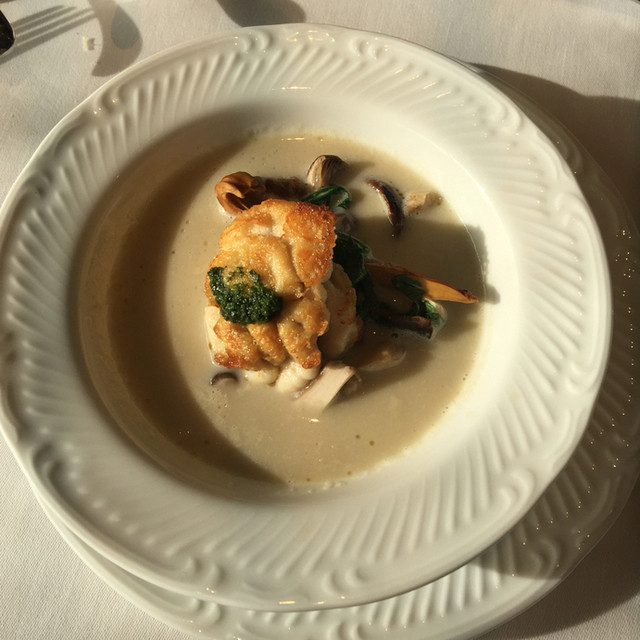 淡泊な雛鳥は脂が強くなくサッパリ感があるが、旨味のある海老や帆立を加え料理としてバランスを取っている。