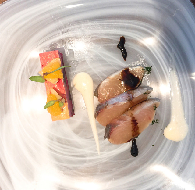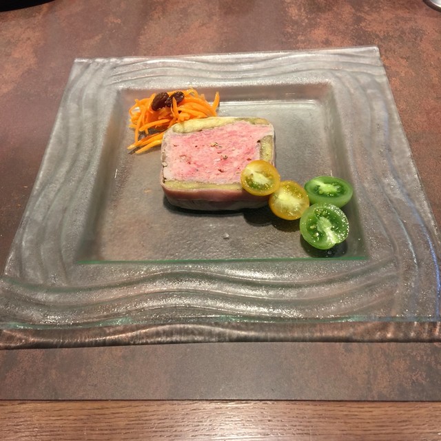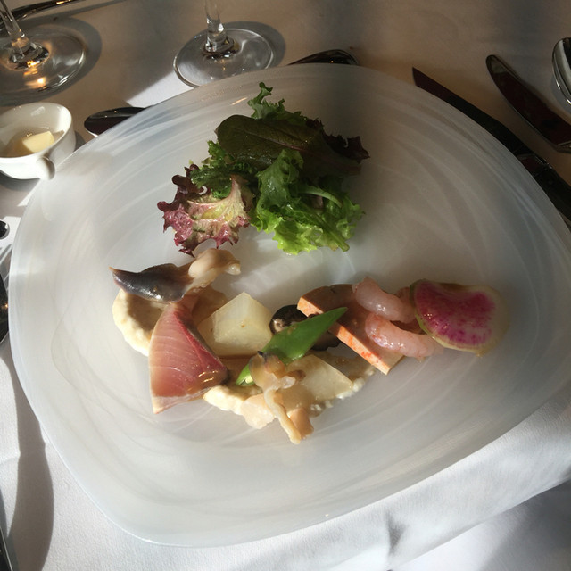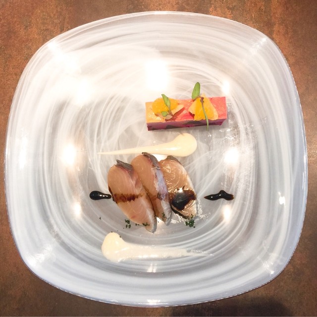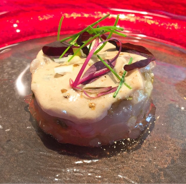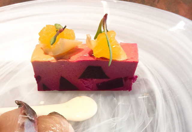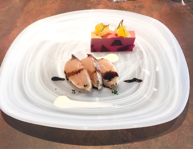 続く冷菜はカワハギと甘海老 林檎のタルタル 肝のムースリーヌと軽くヴィネガーで〆た鰆のカルパッチョ&ビーツとフェタチーズのクラフティだ。