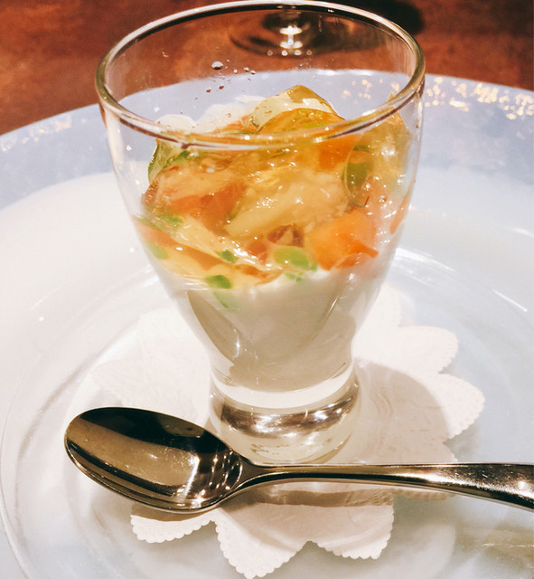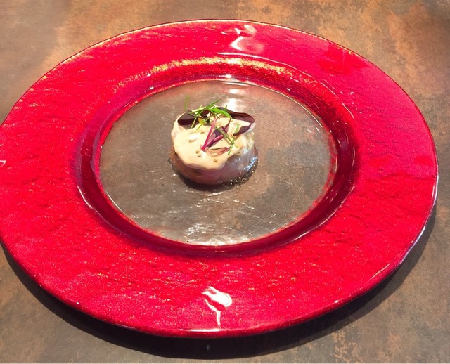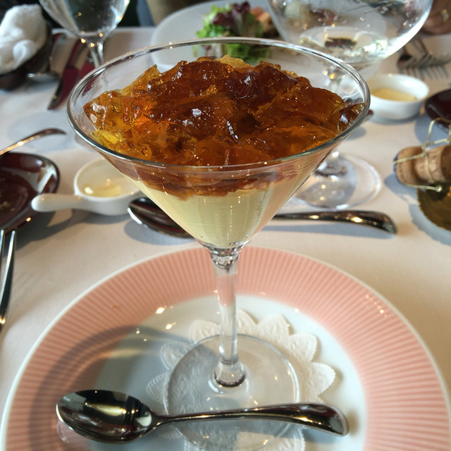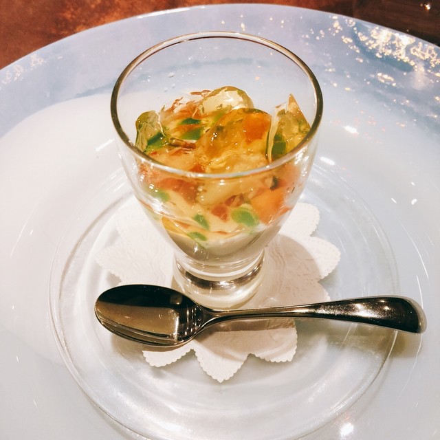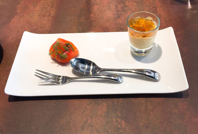 ムースの色も黄みがかっていて、上の半透明な赤橙色のコンソメのジュレとのアンサンブルが目を魅了する。
