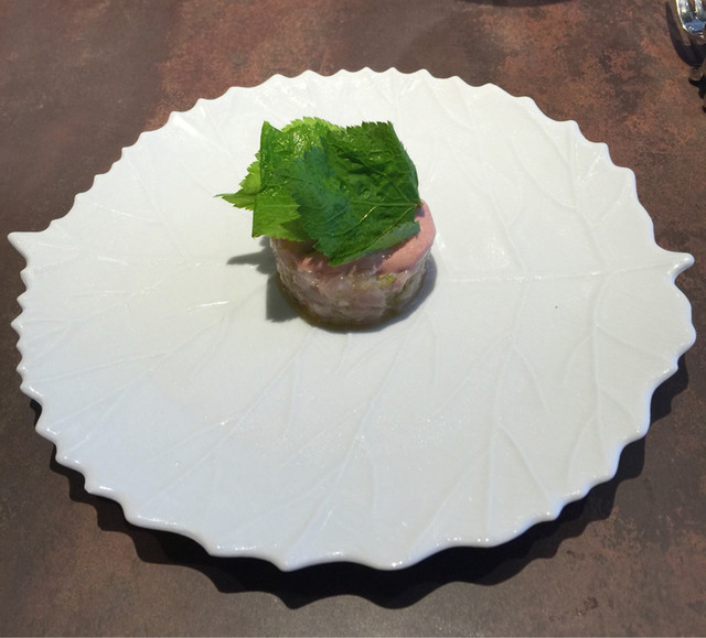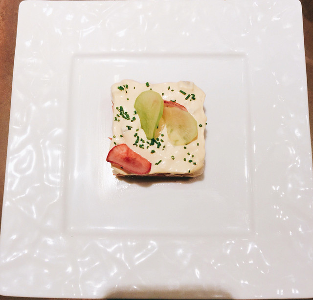 枇杷と金目鯛のタルタル トマトクリーム シェフの実家で採れた天然三つ葉のサラダ 2016-6