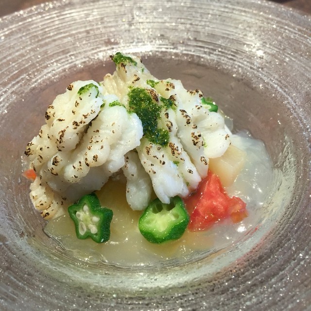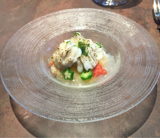 白桃のムースと活け〆鱧と里芋 緑茶のジュレをのせて 2016-6