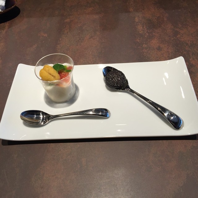 枝豆のブランマンジェ雲丹と白海老を添え 雲丹クリーム・ソース 鯵と帆立貝とトウモロコシのタルタルフィオーレサルドとセルバチコと一緒に 2016-8