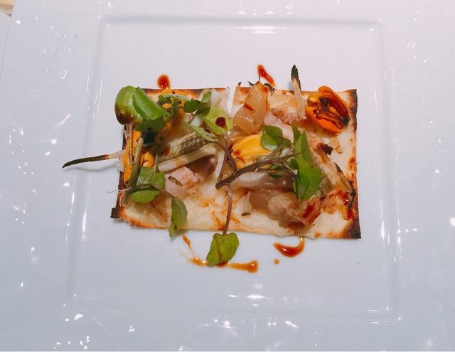穴子、ムール貝、牛アキレスのタルト・フランベ 牛蒡、玉葱、ベーコンのエチュベを敷いて 2016-8
