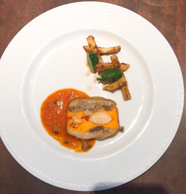 続く温菜はオマール海老のムースと豚足のテリーヌ タイム風味のトマトソース。