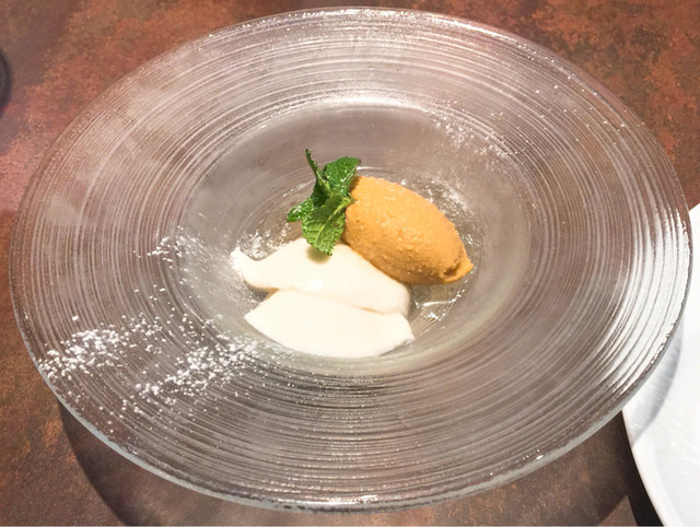 新玉葱のブランマンジェトマトのグラニテと雲丹を添えて(新作)