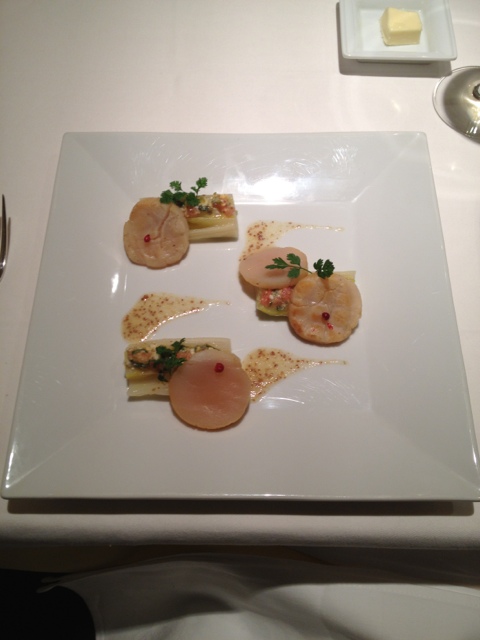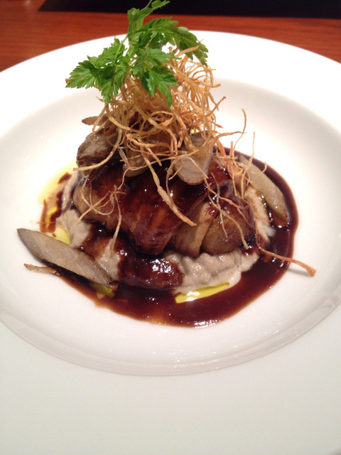 この日いただいたのは前菜が「帆立貝のスモークと下仁田葱のマリネ 柚子のラビゴットソース」「白インゲン豆のポタージュ、フォアグラのフラン鴨のコンフィ添え」の二品。帆立はお皿からスモークの香りが立ち昇り、食欲を掻き立てられました。冬の下仁田葱は柔らかく味も抜群、毎年の楽しみですね。柚子の香りが日本人で良かったと思わせます。フォアグラのフラン と鴨のコンフィが非常に旨かった!言う事なし。