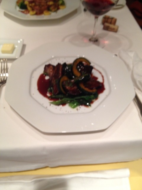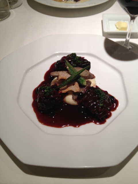 オマール海老と豚足の包み焼きは、ご想像通りの美味しさ。パルマンティエは普通挽肉を使っていて、フランスの家庭料理ですが、挽肉をオックステールの赤ワイン煮に変えレストラン仕立てにしています。日本の八百屋では仲々手に入らない根セロリを使っているところもフレンチらしくていいですね。マッシュポテトと赤ワイン煮のバランスも良く、お腹にドッシリと溜まる一品です。赤ワインが進みました。