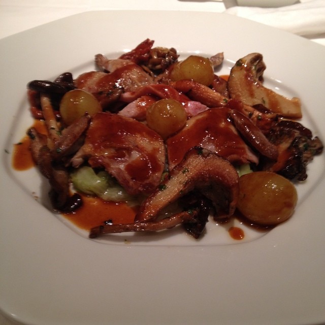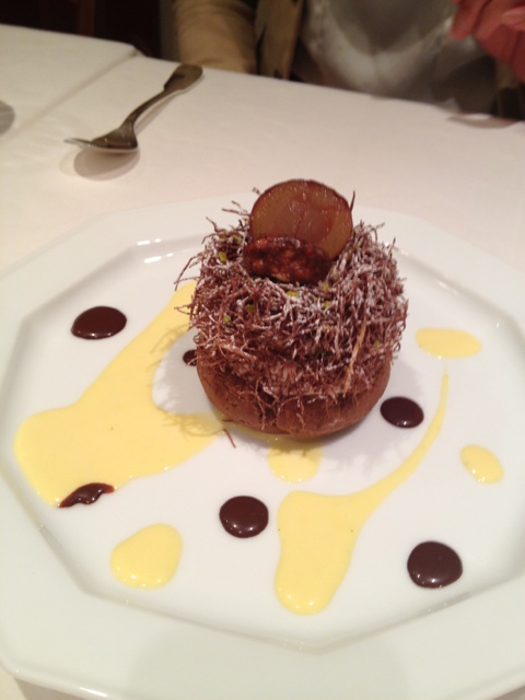 メインの中では鶉のマスカットソースの出来が良かったでしょうか。仔ウサギのウイキョウ詰めも良かったですが、ウイキョウがもっと前面に出ていた方が私は好きですね。家人はマルシェで売っているウサギがそのままの姿をしているので、ウサギが苦手ですが、私は大好き。お肉も柔らかでした。主賓が食べていた和牛は、首の肉を赤ワイン煮こんであるので、美味しく無い訳がない。マーマレードもほんのりと甘さを出している程度で、丁度良い具合です。鯛は山口産だそうですが、貰うのを忘れました。