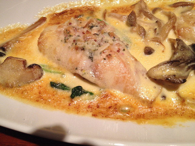 年甲斐もなくソースを夢中ですくった。この料理の主役は、尾長鯛でもなく、キノコでもなく、間違いなくソース!