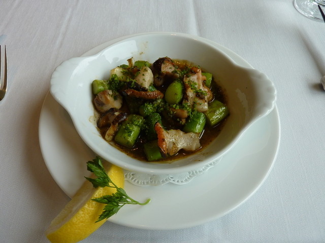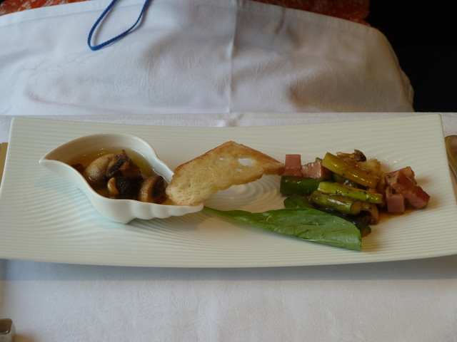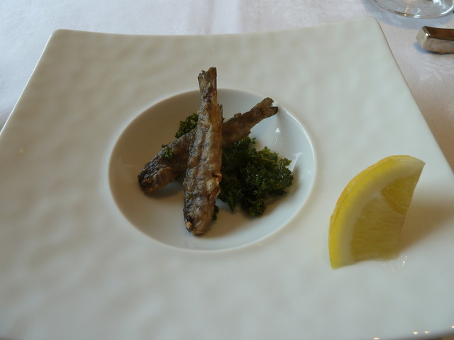 今回はラ・フォーレコースを2人で頂きました。オードブルは私が仔牛胸腺肉とモリーユ茸の軽い煮込みで、カミサンがスモークサーモントラウトとセロリラーヴ ソースレムラード。スープは2人ともオニオングラタンスープで、メインは私が前回と同じ羊肉と野菜の煮込み クスクスを添えてで、カミサンが国産豚のスペアリブ薪火焼きです。ドリンクは私がコーヒー、カミサンが紅茶をそれぞれ頂きました。さて最初はいつもの小さいニジマスとパセリのフライです。これはいつもそうなのですが、2人で「きっと我々、ニジマスを100匹は食べちゃったね」と笑い合いました。そしてオードブル。これはどちらも本当に美味しいものでした。私の胸腺肉とモリーユ茸の煮物はトロっとしたソースに美味しいお肉と茸がたっぷりでパンで拭きながら綺麗に頂きました。実に濃厚で美味しいオードブルです。ふわふわパンもバターで頂いてもお料理のソースで頂いても本当に美味しく、お料理を更に美味しくしてくれます。
