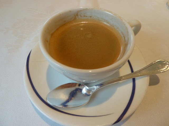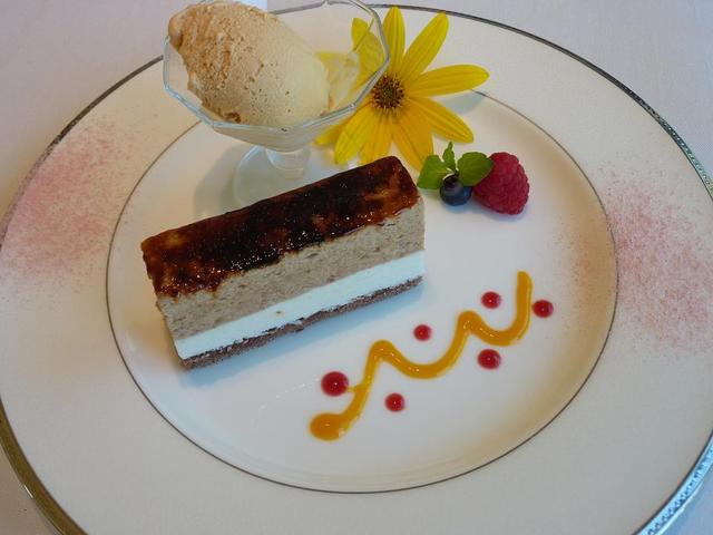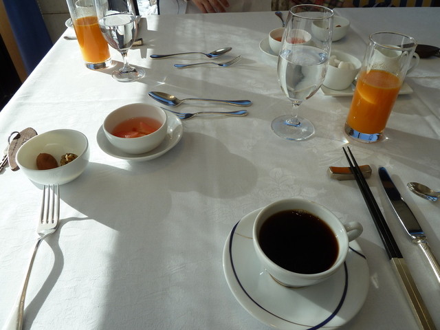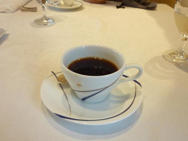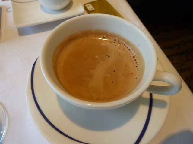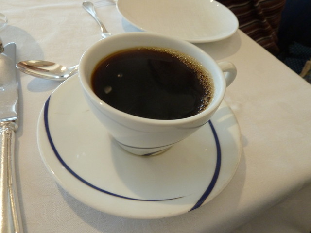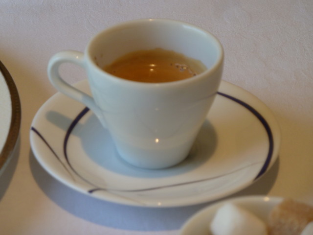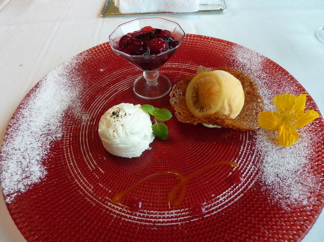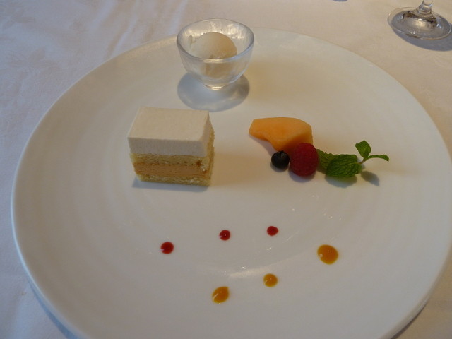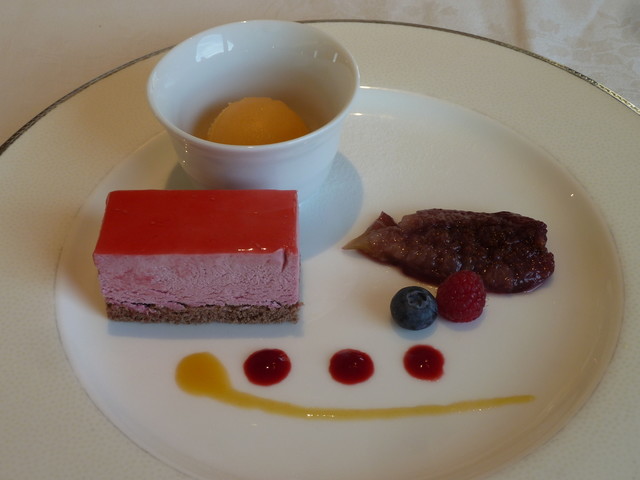 デザートはベリーのムースケーキにあんずの柔らかなシャーベット。これがまた美味しくて声が出ません。ベリーのムースのクリーム感がたまらなく、シャーベットも爽やかでどちらも満足なデザートでした。美味しいコーヒーを頂きながらカミサンとニコニコしながら頂きました。