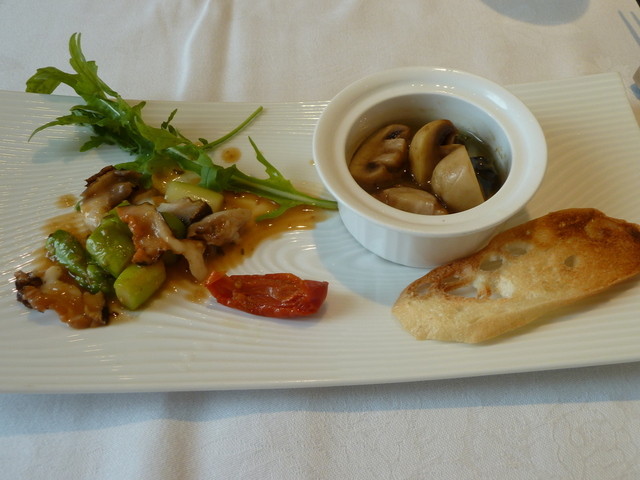 サザエとアスパラの炒め物に、マッシュルームと肝のアヒージョ