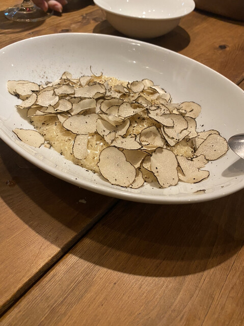 サマートリュフのリゾット、チーズがパンに乗っかったやつ(名前忘れてしまい)どれもこれも美味しすぎました、、トリュフをサクサクと食感を感じるほど沢山入っていました。鼻から抜けるトリュフの香りがたまらなかったです。