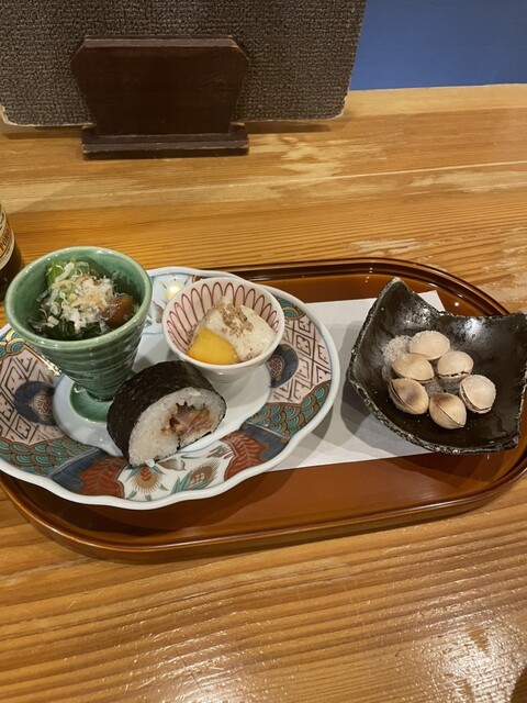 ・おつまみプレート(小松菜お浸し、柿の白和え、塩辛海苔巻き、銀杏)/志太泉 純米八反 日巫女ラベル