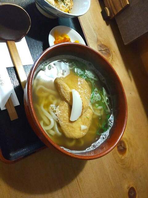 奈良に用事がありお昼になってしまい どこかないかうろうろしてたんですが うどん屋さんの看板発見 奈良にうどん 直感でうまそうな雰囲気 タベロクは点が低めでしたが うどん大好きなんで入りました、キツネうどん 大きなお揚げさんが二枚いい味付けでお出汁はかつおかな 良くきいてました、少しご飯もんも欲しいので玉子丼も頂きました、トロトロの仕上げとお米も美味しかったです。今度はまた、違うものを食べたいなぁと思いました。初めて行ったんですが大満足です。ご馳走様でした。