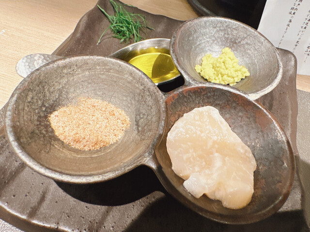 鰹塩、わさび、ディルハーブ、つけ汁、との順番を繰り返し後半はレンゲにトリュフオイルをかけて、これがまた旨い‼️良い香り