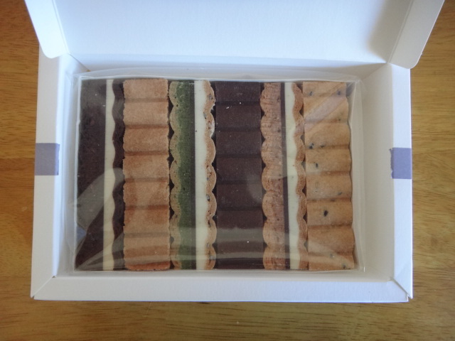 箱の中には、抹茶、プラリネ、ショコラ味のお菓子がきっちりとおさめられていました。