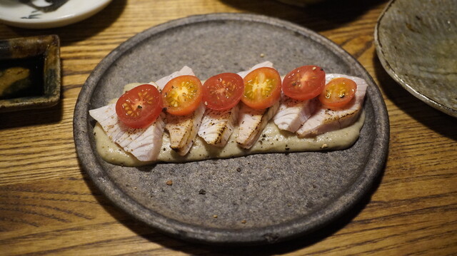 シンプルな前菜料理ですが、黄色のプチトマトを合わせた、盛り付けの妙!日本酒、洋酒、何にでも合いそうな最高級の酒肴。
