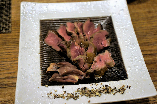 これはオーソドックスなレバーなのですが、半生の状態がすんばらしい!口の中でとろっととろける食感は最高級のまるでレバーペースト!!粗挽き胡椒の添え方も上手い。