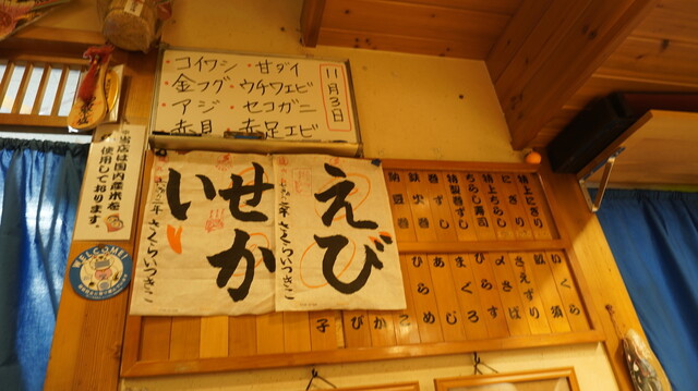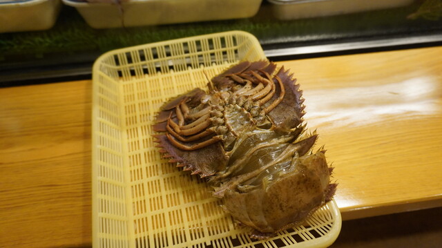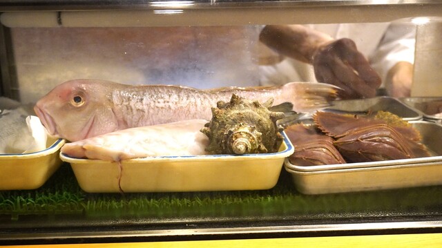 グジ(甘鯛)、サザエ、うちわエビの並ぶケース