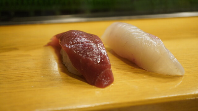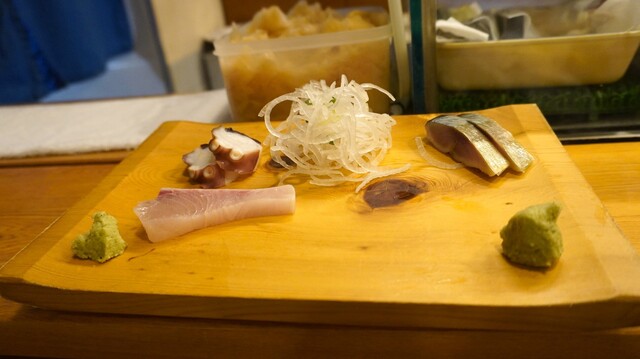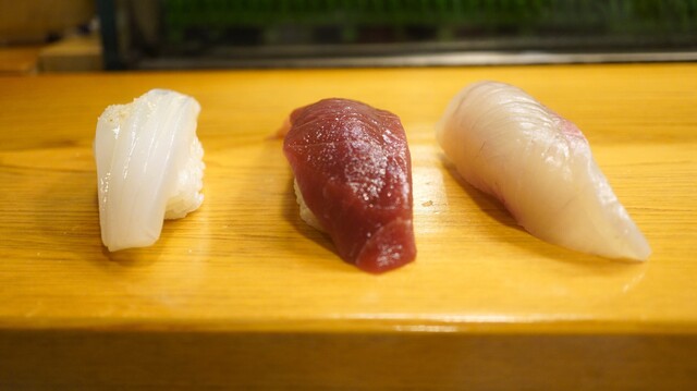 アジ、しめ鯖は軽〜い酢漬け、近海の生マグロ(キハダ?)、ひらす(ヒラマサの長崎での名前)。
