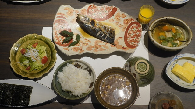 カマスの焼物に、赤出汁の汁物、南瓜など野菜の葛餡煮、サラダなど。