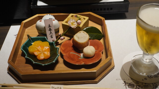 前 菜 =ユリ根の茶巾、金柑ゼリー、梅人梅人参紀州煮、スナップエンドウの胡麻掛け、