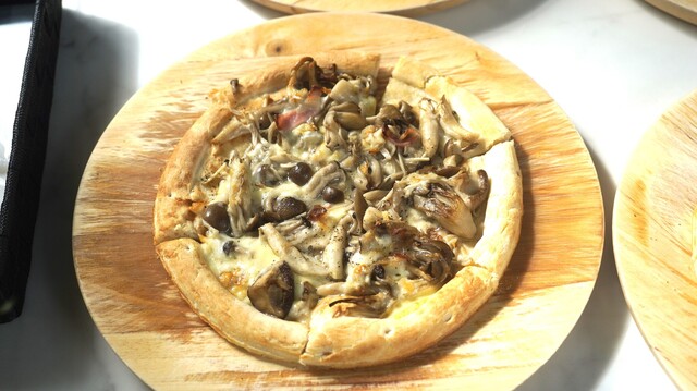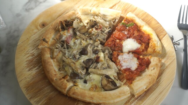 ピザは定番のマルガリータか本日のピザからセレクト。この日のピザはキノコとベーコンでした。