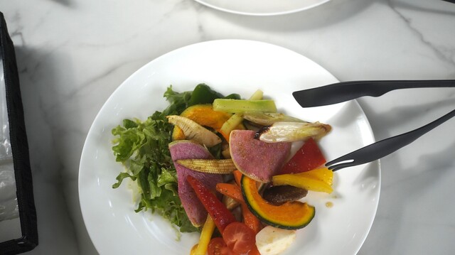 サラダが絶品。焼いた葱、煮付けたニンジン、生のピーマンや蕪。特に、生のピーマンやパプリカが甘くて最高。