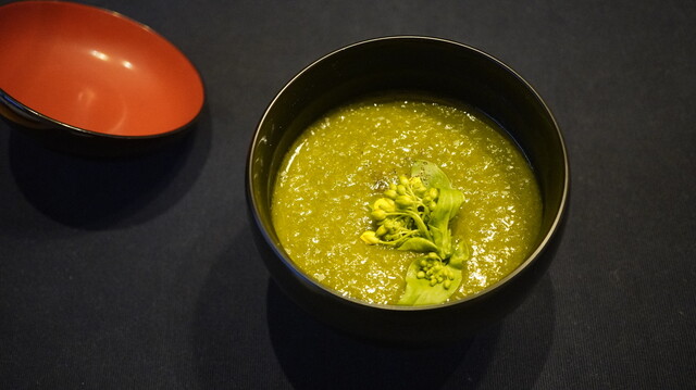 ②菜の花のポタージュ、いしり仕立て
