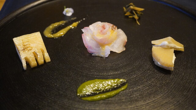 ①アンティパスト=べんこうこ(いしる漬け大根)とクリームチーズ、真鯛、いしる塗り茹で筍、