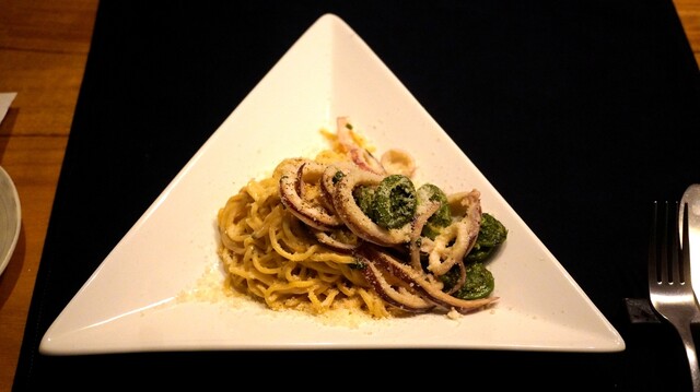 ⑥イカとコゴミの手打ちパスタ