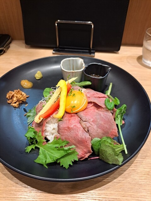 今回もいつもの事前予約して来店いたしました。念願のローストビーフ丼をまずいただきます。宮崎の霧峰牛を使用してコミュール風にオリジナルと大葉の2種類のソースでいただきます。お肉が何とも旨味を持っておりゴージャスな丼にもなってます。添えられたわさびとの相性もまた格別、味変も楽しめてこれもまた楽しみが増します。野菜もまた彩り豊かに食欲増します。