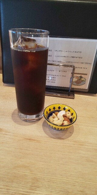 ツキイチでお世話になってますが、今回はアイスコーヒーをいただくことにします。フレッシュ、ガムシロップはあらかじめ付けない旨を伝えます。すっきりして淡く苦さ控えめ、ナッツが小皿でサービスされます。