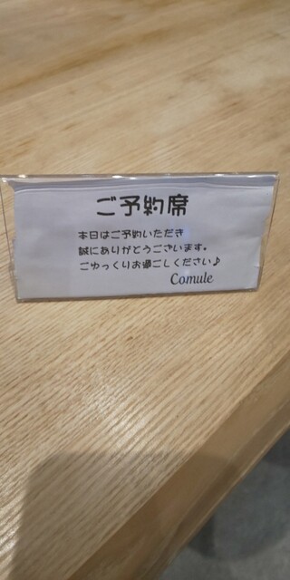 コミュールは事前予約の上で来店いたしました。金曜日のディナータイムは営業しているものの、事前予約が必要になります。いつもなら18時台でお願いしているのを、残業の事情で19時台で設定しました。が、やや遅れてしまいまして、何とか着きました。それでも店主様の寛大な対応には感謝したいです。どうやらこの日は別の1組がすでに利用しており、若者の笑い声が聞こえてきます。