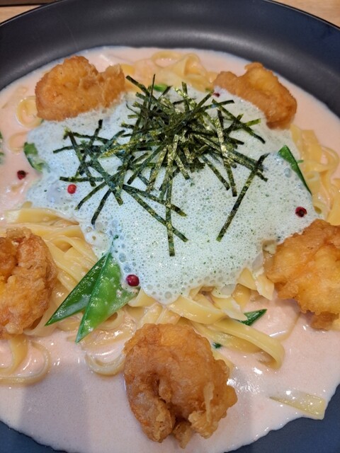 海老のフリットと絹さやの明太クリーム 大葉のエスプーマのパスタ(¥1180)