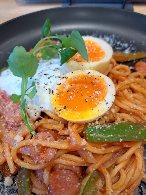 パフェ系やランチメニューの一部が可能でしたが、近日登場するリニューアルした「煮卵つきのナポリタン」をお願いすることにしました。これが完成品にはなるものの、現時点ではメニュー表に反映はまだしてません。仮にはなりますが、近く登場予定は間違いありません。