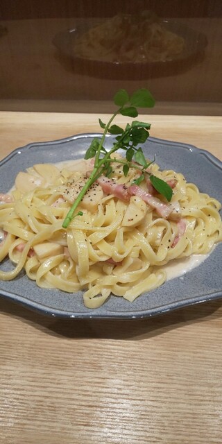 藍色のお皿が、盛り付けがうまく演出してくれる。この見た目だけでもインパクト強い。麺は平麺の独特なモチモチ感、これはたまらない!クリームベースのソースも鮮やかな味わいだ。チキンコンフィの柔らかさを実感しながら完食できました。いつもありがとうございます。ごちそうさまでした。