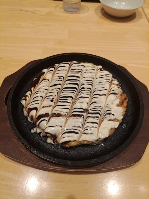 「よるちぼーセット」という店舗限定の夜のセットがありました。早速これを利用していきました。最大の嬉しさは、とんぺい焼、豚広島焼き、そして追加したいか焼きそば、出来立ては当然ながらすごく旨味を実感できて美味しく完食できました。とんぺい焼と広島焼では店員さんが「マヨビーム」をいたします。焼きそばには「もう逃れられない、旨みと辛さ」の激辛ソースを駆使しました。